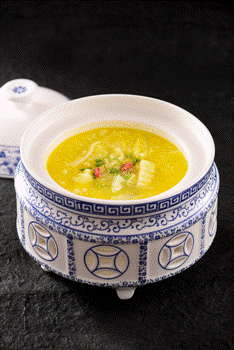 小米粥是餐桌上常见的食材,可你一定没吃过用筒骨、老鸡、瑶柱熬制的老汤煮的小米粥,鲜味十足。每一颗小米都吃饱了老汤的鲜味!,感软糯浓厚。上菜的白瓷大碗里除了金灿灿的小米,还堆满了炖至软烂的娃娃菜和口感绵密的土豆块,还有几棵娃娃菜从小米粥中探出头来,一大碗金灿灿的米粥把菜包裹起来,看起来略略的乡土,做法却精致道近乎严苛。尝尝味道,便觉得在长春这样的东北城市里,有这么一碗热情温暖的食物存在真的很美好。