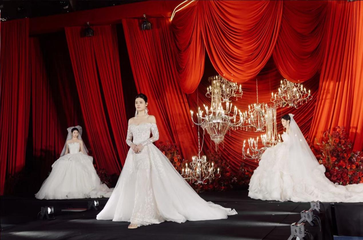 随后,一场惊艳的高定婚纱走秀如期上演,模特们身着各式精美婚纱,步履轻盈,精致的剪裁、璀璨的装饰,将新娘的优雅与灵动展现得淋漓尽致,为在场准新人带来一场视觉盛宴,也让大家直观感受当下婚尚潮流趋势。