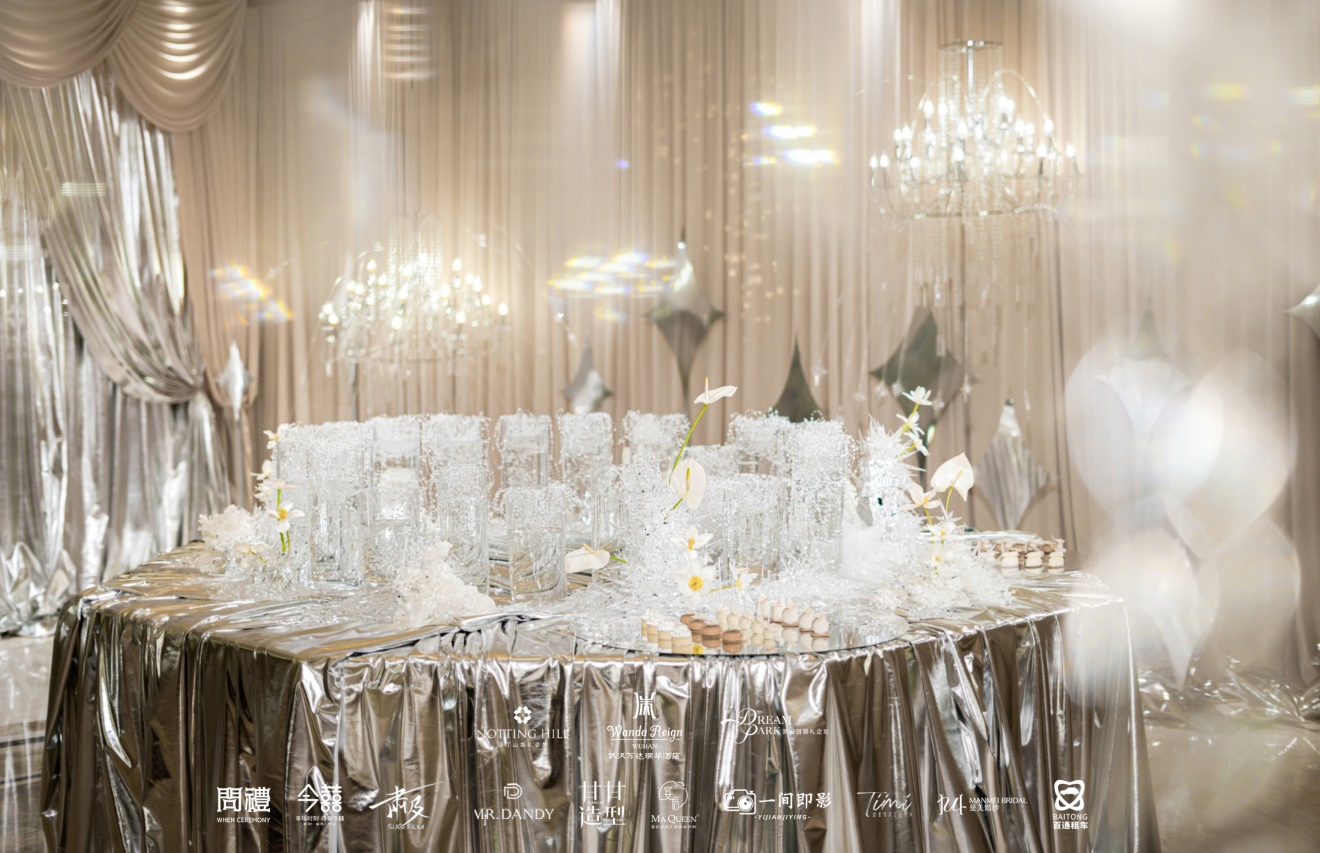 沉浸式场景,定格浪漫瞬间。活动现场以香槟色与银色为主调,灵动的水晶装置与飘逸的纱幔交织出层次丰富的视觉效果,银叶花艺点缀其间,在水晶吊灯的折射下,每一处细节都闪耀着精致的光芒。
