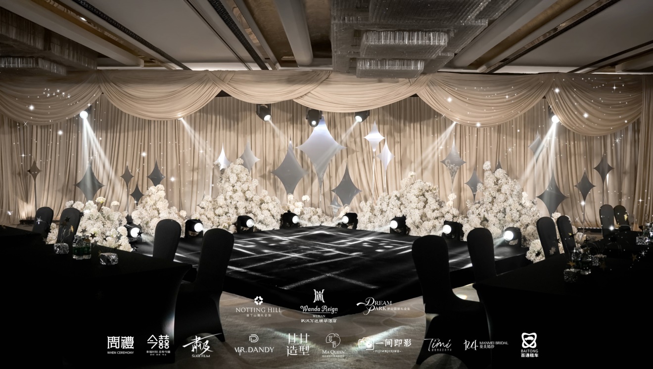 内区以柔纱与银叶花艺勾勒出优雅轮廓,搭配璀璨水晶吊灯,让每一位来宾都仿佛置身于星光隧道。主舞台以星光为灵感,黑色镜面T台在追光灯下如星河流动,两侧的花艺装置与几何装饰,营造出高级而梦幻的仪式感,步入现场开启浪漫之旅。