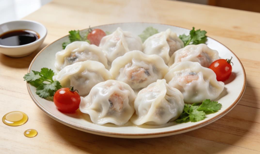 煮好的鲅鱼饺子,外形饱满,皮薄透亮,隐约能看见内里青白相间的馅料。