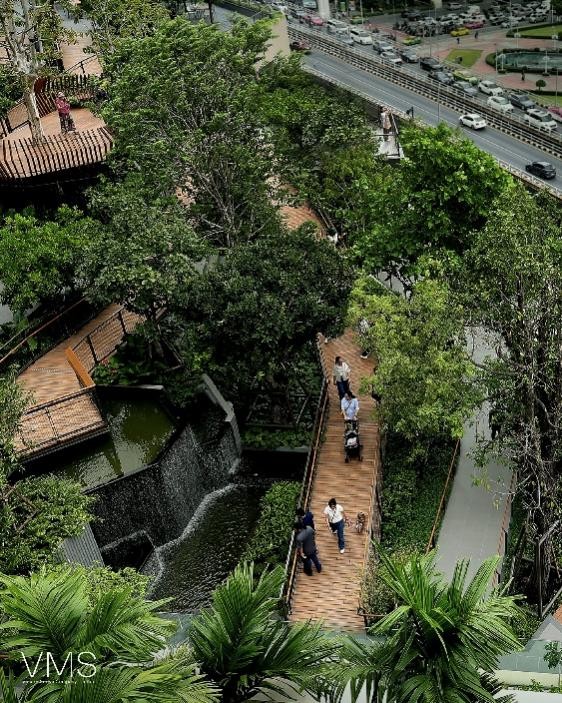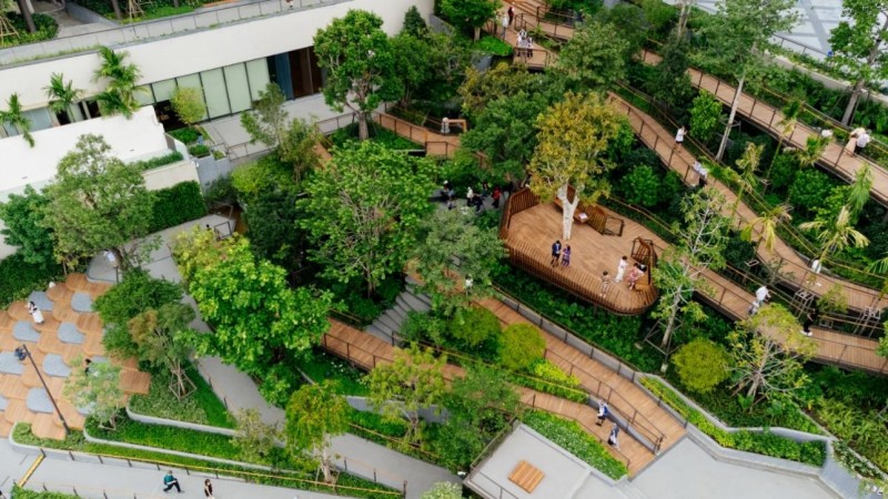 项目中最具标志性的公共空间之一,是向公众开放的 Dusit Arun Park。这是一座位于综合体上方的大型空中公园,占地逾万平方米,是泰国规模最大的城市屋顶公园。公园整体以“城市绿洲”为理念,规划了多条步行路径、观景平台、草坪与休憩空间,并通过大量热带植物景观,弱化高密度城市带来的压迫感。依托立体景观设计,公园将城市、自然与人重新连接在一起。