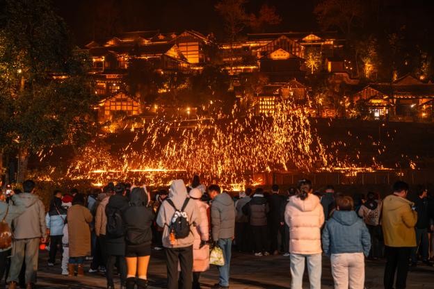 更具视觉冲击力的,是传承千年的“非遗打铁花”。高达1600℃的铁水被击打向夜空,顷刻间化作万千流星,如金雨倾泻,与水面倒影构成“火树银花”的奇观。此外,融合了傩文化内核的“千傩万象” 大型演艺、惊险炫目的空中火舞秀,以及众人围聚的篝火晚会,将共同把夜晚的热情推向高潮。